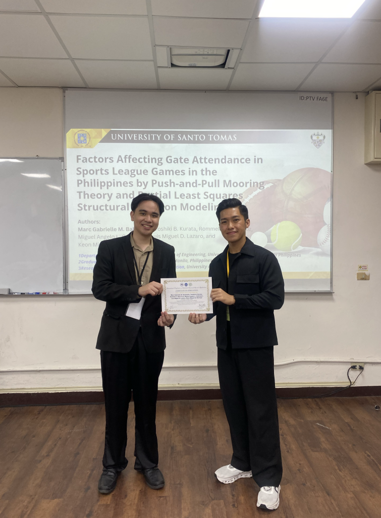 The study was co-authored by Luis Miguel D. Lazaro, Miguel Angelo L. Cabangon, and Keon Miguel B. Maniego, under the guidance of Engr. Yoshiki B. Kurata, Ph.D., CIE, AAE, and Engr. Rommel C. Dela Cruz, MSIE. It aimed to determine the key factors influencing gate attendance in Philippine sports league games, utilizing the Push-and-Pull Mooring Theory framework and analyzed through Partial Least Squares Structural Equation Modeling (PLS-SEM) to provide insights into audience behavior and engagement dynamics.