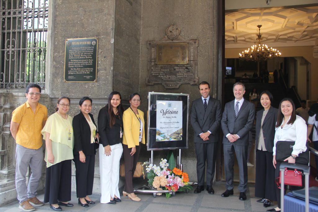 Digital Education Council President Mr. Danny Bielik (sicth from left) and CEO Mr. Alessandro Di Lullo (seventh from left) with officials of the Office for Information and Communications Technology, led by UST Assistant to the Rector for ICT Asst. Prof. Jerralyn Padua (fifth from left) Acting Director Asst. Prof. April Joy M. Gascon (third from left), and CITED Director Asst. Prof. Ana Ruby Paez (second from left) were assisted by UST Office of Public Affairs Director Ms. Michaella Lagniton (eighth from left) in welcoming the esteemed guests on May 6, 2025