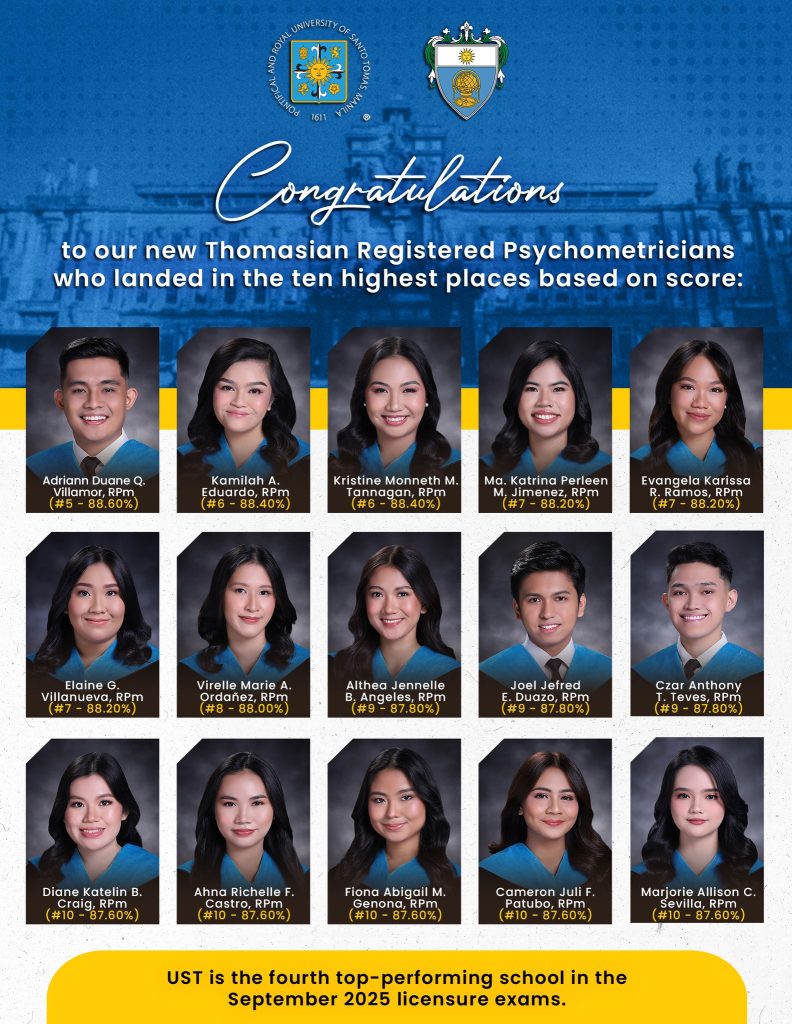 UST was named the #4 top performing school in the 2025 Psychometricians Licensure Exams after making the cut in the 100-299 examinees category. The University likewise produced 187 new registered psychometricians who registered a 98.42% passing rate.